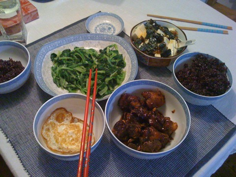 雪糯米白饭糖醋小排皮蛋拌豆腐炒鸡毛菜耗时1小时完成全部吃光了(饭前我们还一人吃了个面包)...以后两个菜看来不够的...