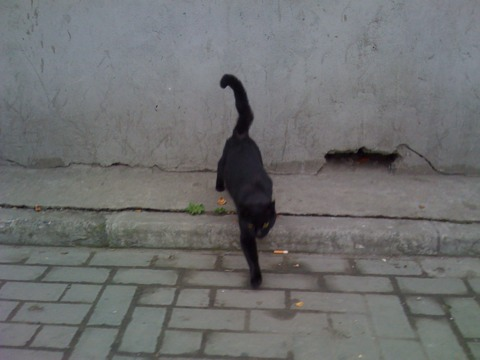 今早下长寿路桥时看到它,皮黑亮,眼珠是黄色的。看到我时它突然很警觉的样子,但是镜头打开时它又把头转开了,我就对它叫"瞄~",它就真的转过来了